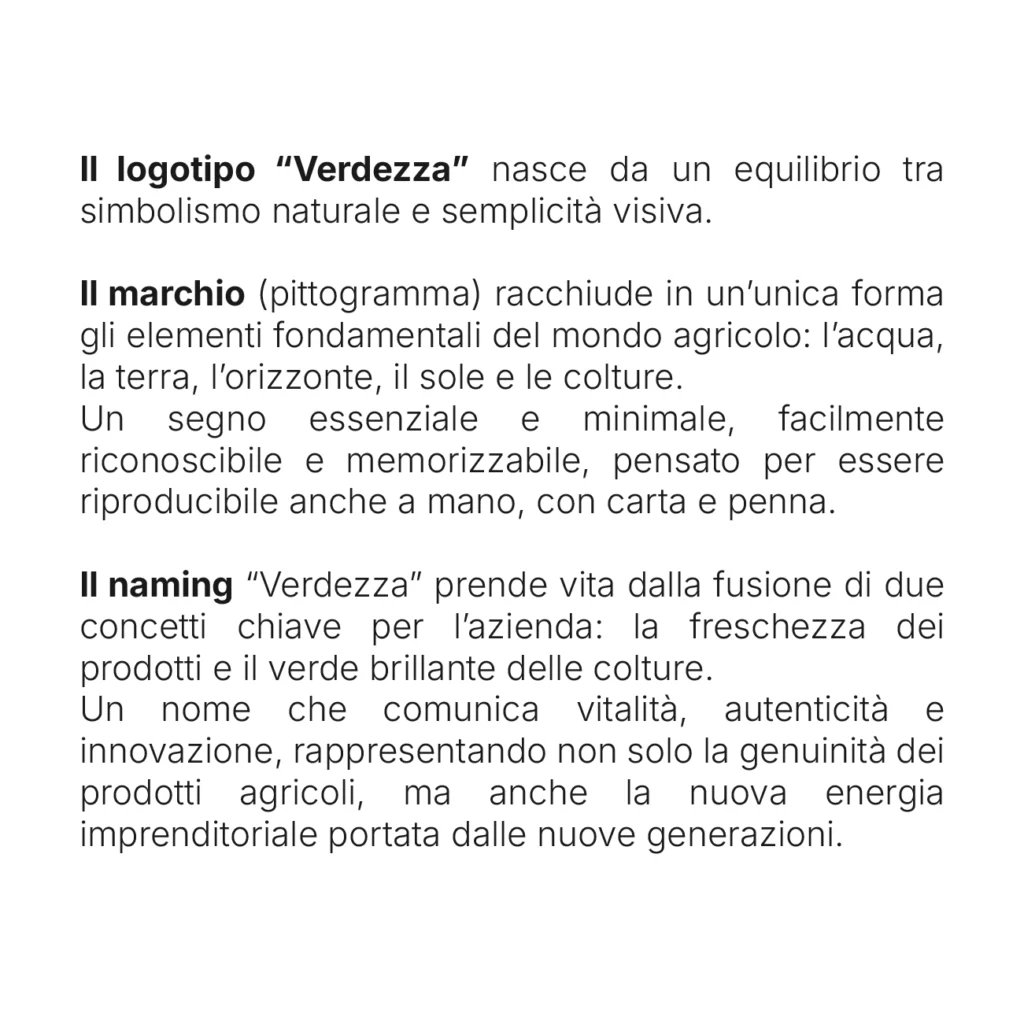 Il progetto di branding per Verdezza nasce dall’unione tra tradizione agricola e visione contemporanea. Il logotipo, essenziale e memorabile, sintetizza acqua, terra, sole e colture. Il naming richiama freschezza e vitalità, mentre la palette verde comunica natura, fiducia, innovazione e un approccio giovane all’imprenditoria agricola.